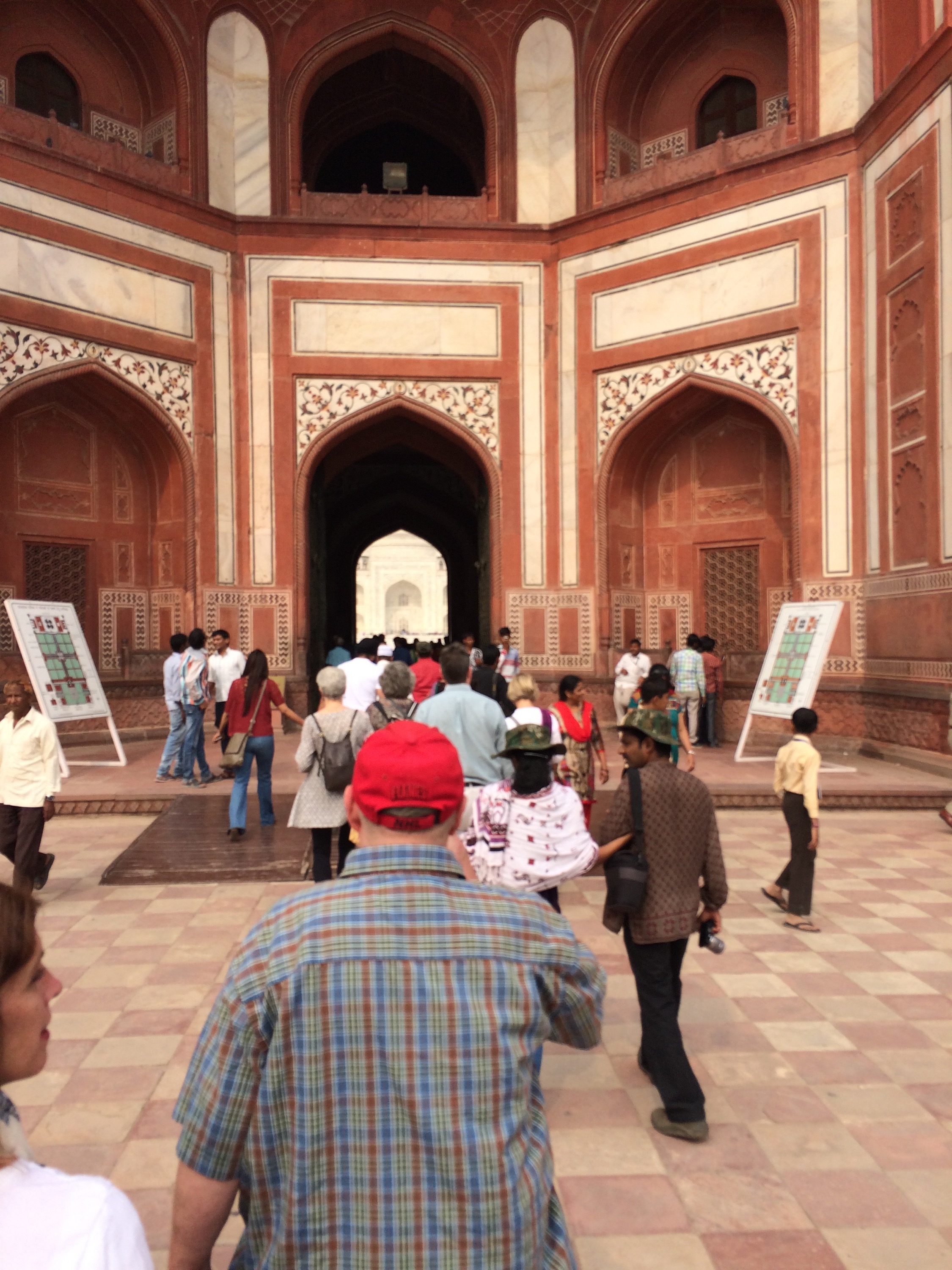 In the main chamber of the palace the only light is the little that filters through the open door ways and the windows set high above us. Photos are not allowed in here, though an occasional flash from the uncontrollable crowd wandering through would go off. Our guide borrowed a smart phone from one of our group and used its flashlight to illuminate a small stone set in the marble in the pattern of the lotus flower. It lit up like a Christmas light and the vision of the mausoleum’s architects was suddenly before us. The interior walls are intricately covered in these stone lotus patterns and you knew that with just the right lighting these stones in their blues, yellows, greens and reds would ignite like a hundred thousand stars. One can book a night viewing of the Taj only in the few days around the full moon. I’m certain it would be worth the long flight to India just to stand in that chamber when the moonlight reveals the genius of India’s architects.