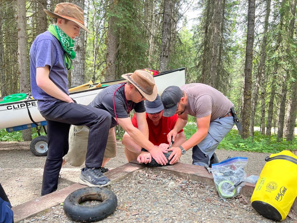 We headed out to the registration office at the trail head to let them know we were running late. In the end, our 9am departure turned into 1pm. Everyone took it in good stride. In our wait for the Chattertons Ted took charge in replacing a tube on one of the canoe cart’s wheels, one of the Boy Scout carts. The Chattertons brought two homemade PVC carts. Ours broke about 500 meters down the trail. It was clear to me (and Lisa before me) that the other wouldn’t make it much longer. 50 meters down the trail carrying the broken cart I heard a wheel pop. I didn’t bother to find out whose wheel popped I just went back to the registration desk and rented 3 sets of wheels. Sure enough, 100 meters back up the trail I met Jaron with the remnants of his PVC canoe cart (it essentially exploded).