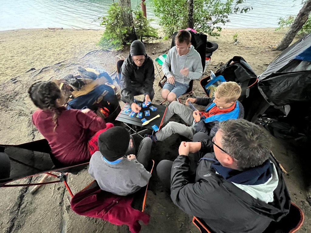 Robyn and Ted were first to arrive at campsite 21. They got a fire going immediately. When we hit the beach next we got our tarp strung up right away. Matt arrived to setup his tarp with Ted over the fire pit. K&A rolled in sopping wet and cold. It was quite the lesson for these kids. Getting them to keep working and keep moving is not an easy task.