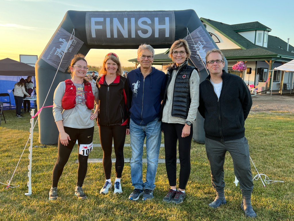 I met all my teammates for the first time at the end of the race when we drove back up to St. Paul to be there to greet our last runner, Victoria. It was an interesting conclusion. We saw the first 100k solo runner come in, a local, Doug Howson with a time of 11:12:29.4. He was the 8th place finisher in last year’s Canadian Death Race. Impressive.