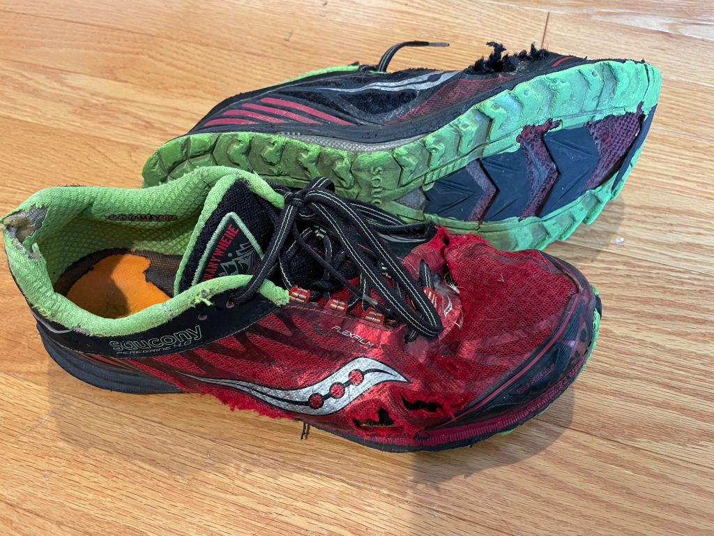 Shoes. I debated between the two pairs of runners I own. When I moved to Alberta at the beginning of 2021 I bought runners best suited for running on the road. Of course, I still have a pair of Saucony trail runners. I bought them the day before the 2015 Canadian Death Race and wore them for the first time at that race. They’ve seen 1000s of miles.