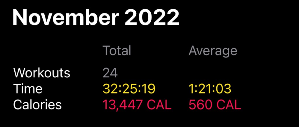 I did alright in November. My numbers are down from October but this is largely the result of that switch to more interval training. The workouts are not as long. Except when they are.