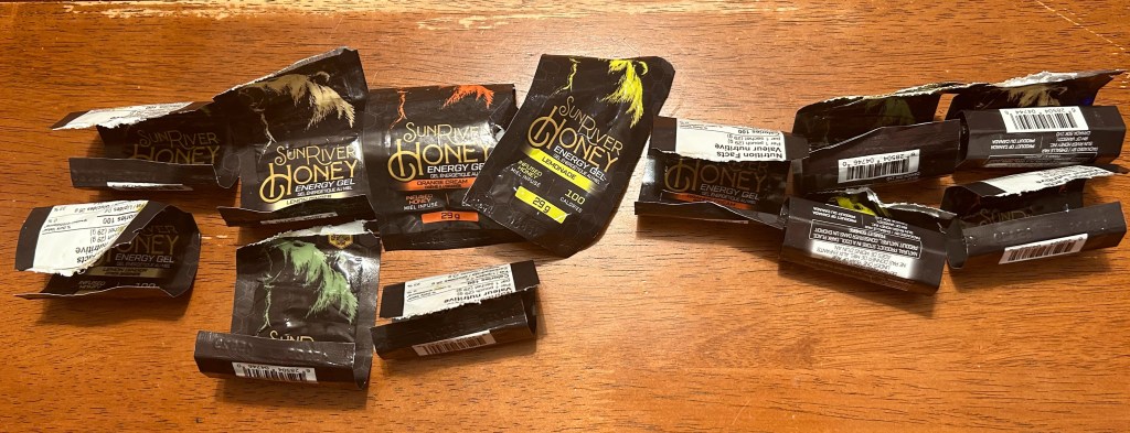 I won’t bore you with a play-by-play of this race. 100 kilometers is a long way. I was in high spirits. I felt good. My nutrition was on point. I switched from GU gels to Sun River Honey and was pleased with the results. I don’t get the gag reflex with honey, and the variety of flavours was great. I try to take a gel/honey every 45 minutes. It seems to come out to one an hour by the end.
